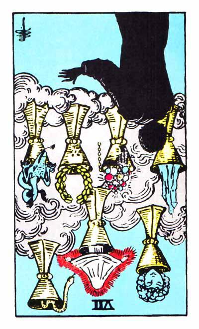 역방향 컵 7번 카드는 여러분이 꿈의 세계에 살아왔고, 마침내 현실로 내려온다는 것을 나타낸다.